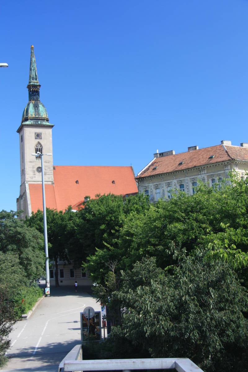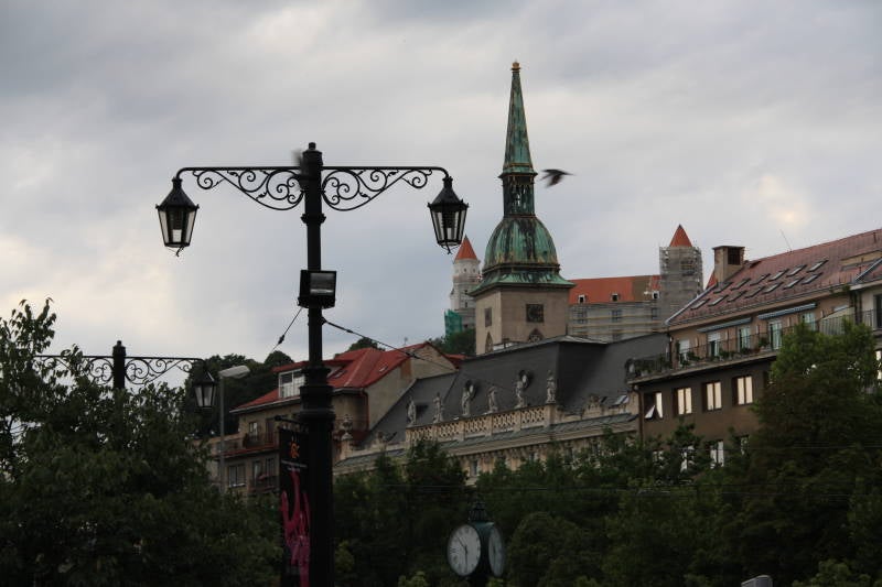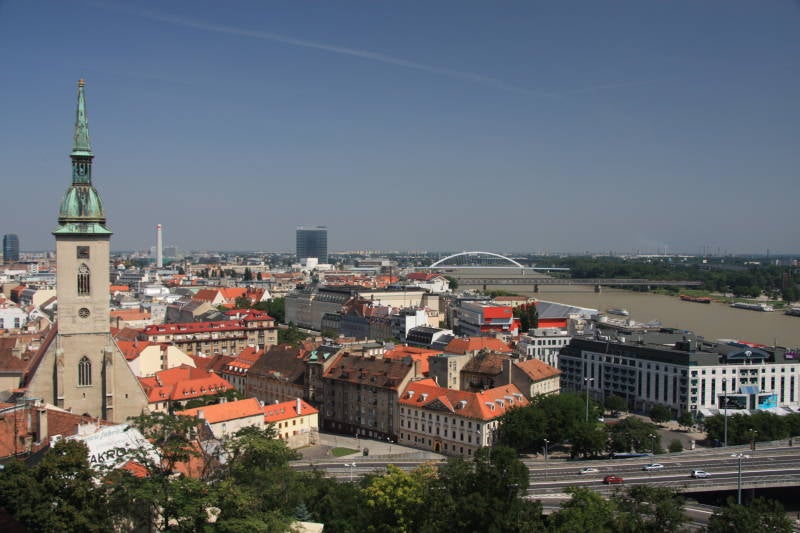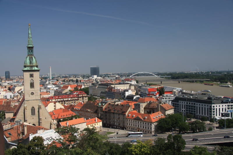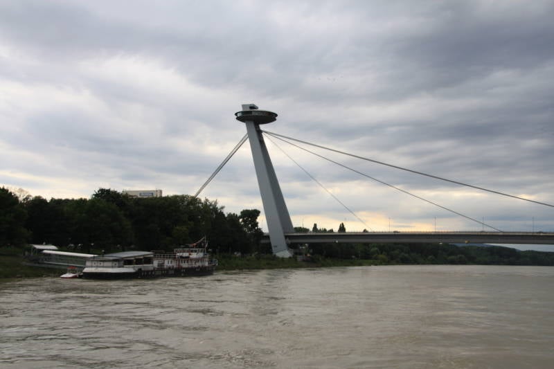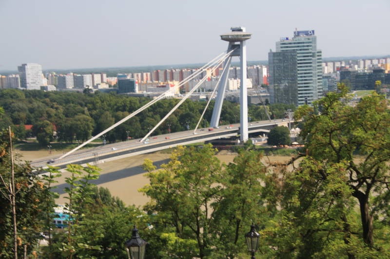 De twee symbolen van de stad, oud en nieuw. De UFO op de Novy Most (nieuwe brug) over de Donau is een bar/restaurant met uitkijkplatform dat een panorama biedt over de stad en de verre omgeving tot in Hongarije op heldere dagen. Aan de overzijde ligt het stadsdeel Petržalka, een naoorlogse uitbreiding met typische socialistische bouwstijl.
