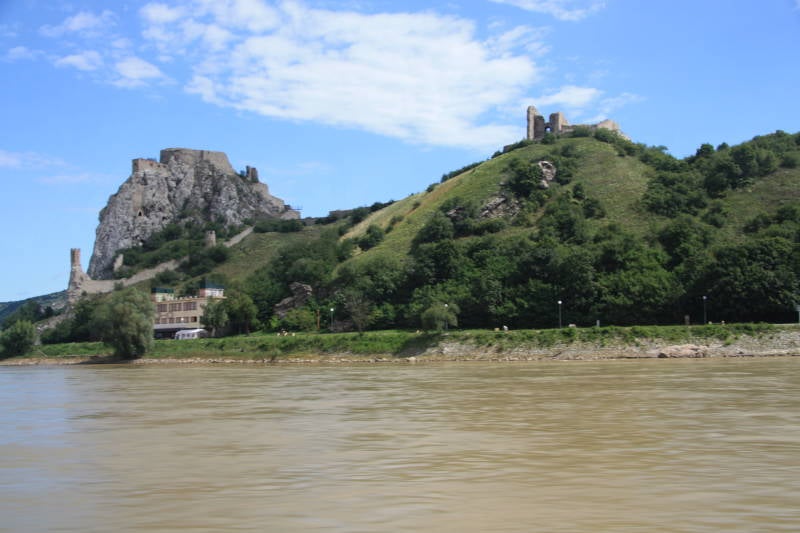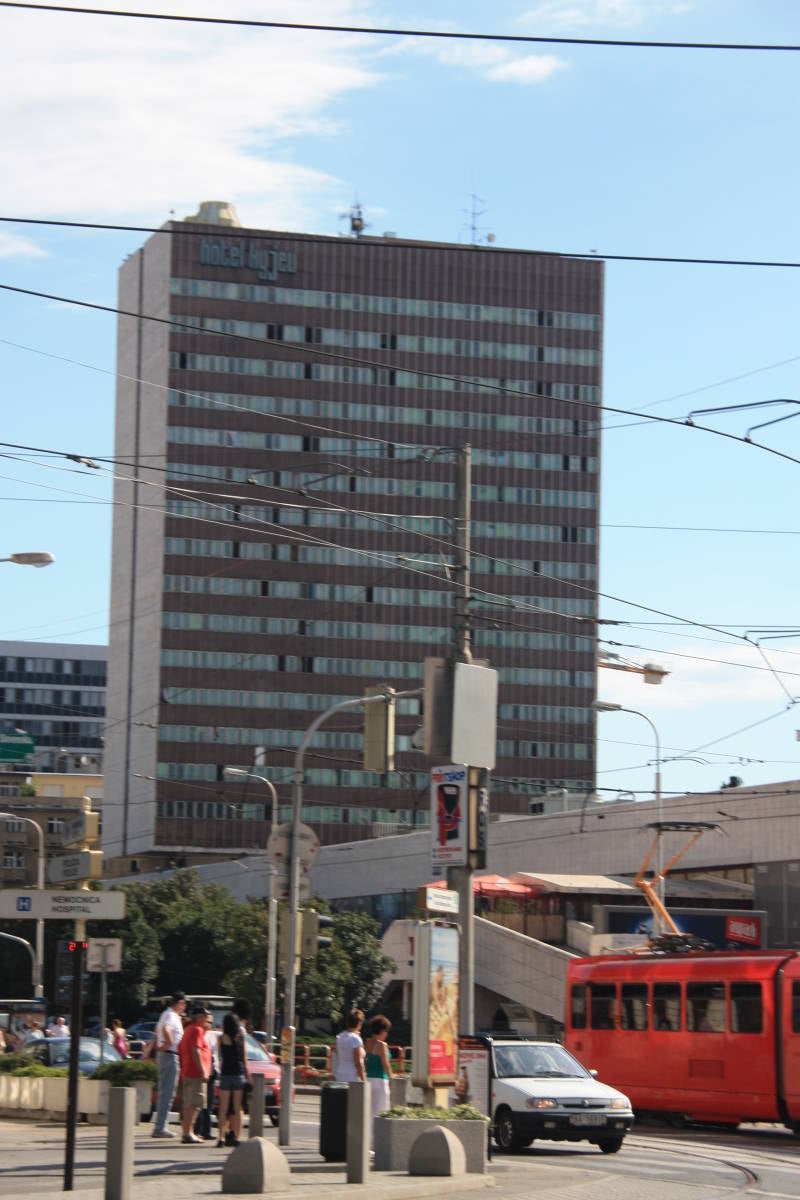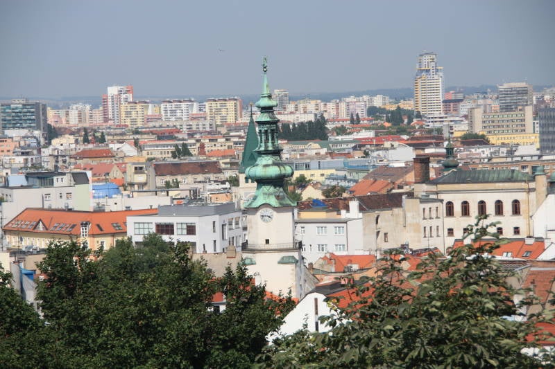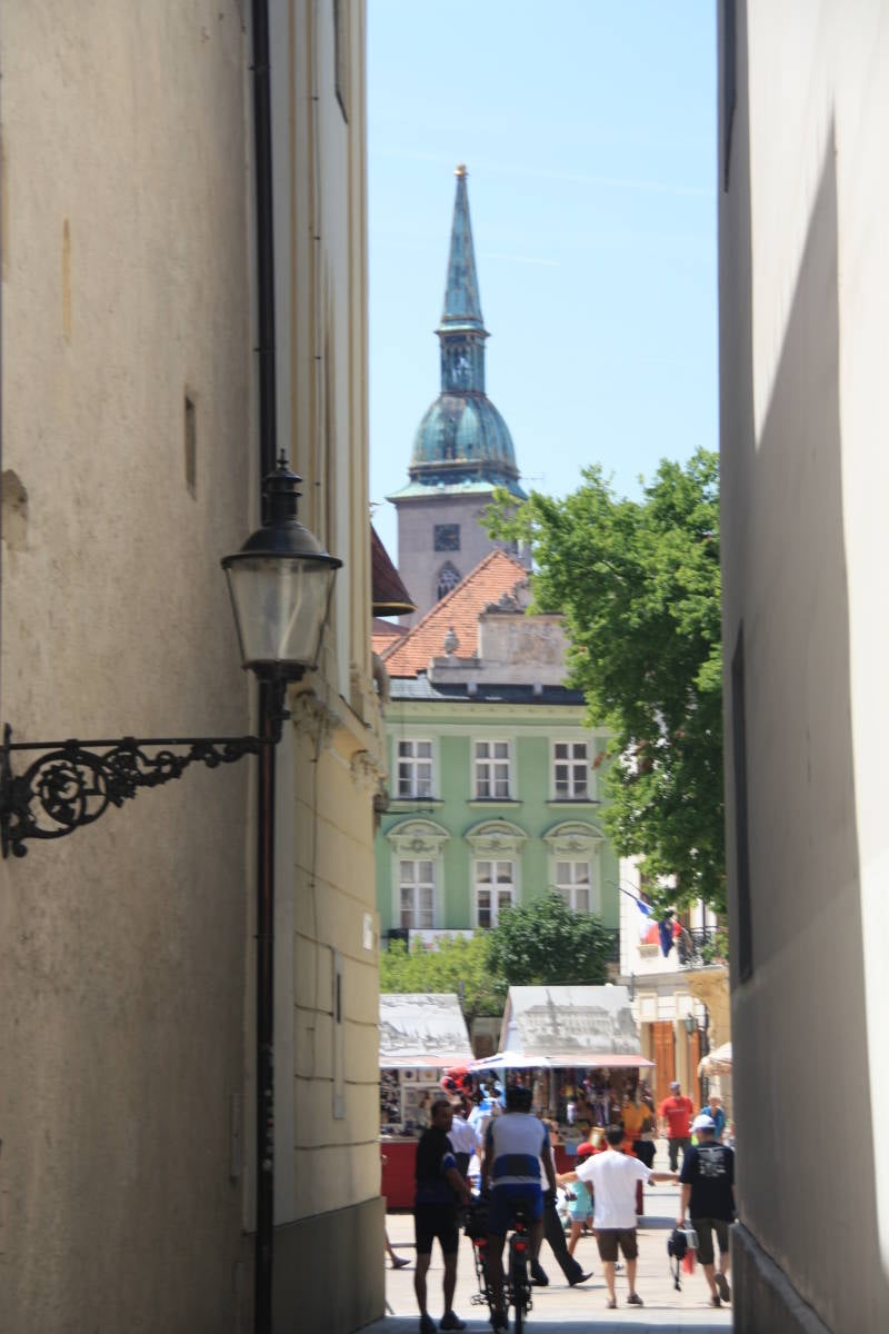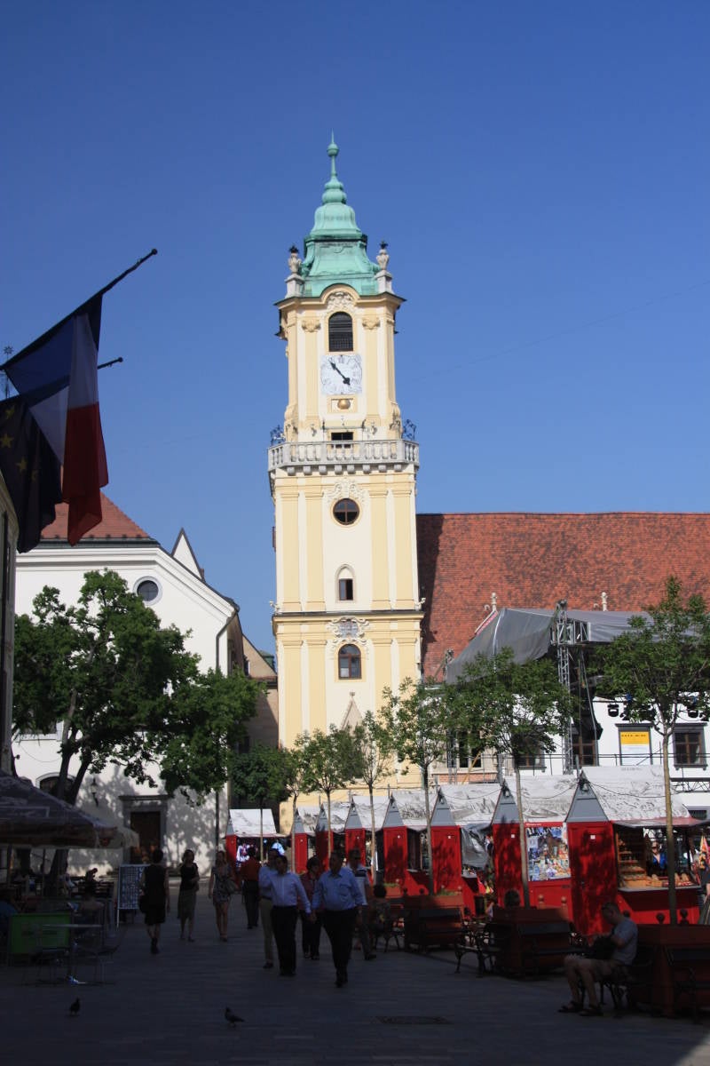De twee symbolen van de stad, oud en nieuw. De UFO op de Novy Most (nieuwe brug) over de Donau is een bar/restaurant met uitkijkplatform dat een panorama biedt over de stad en de verre omgeving tot in Hongarije op heldere dagen. Aan de overzijde ligt het stadsdeel Petržalka, een naoorlogse uitbreiding met typische socialistische bouwstijl.
