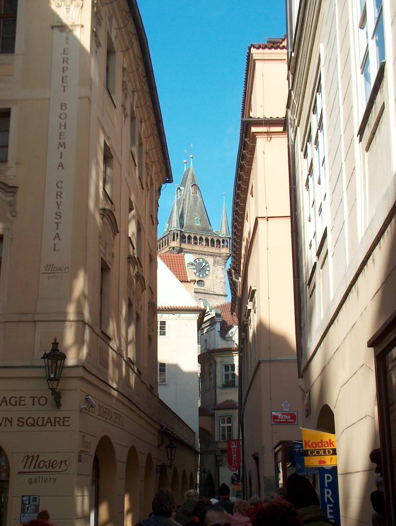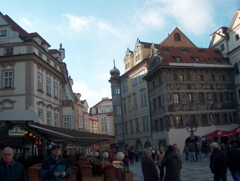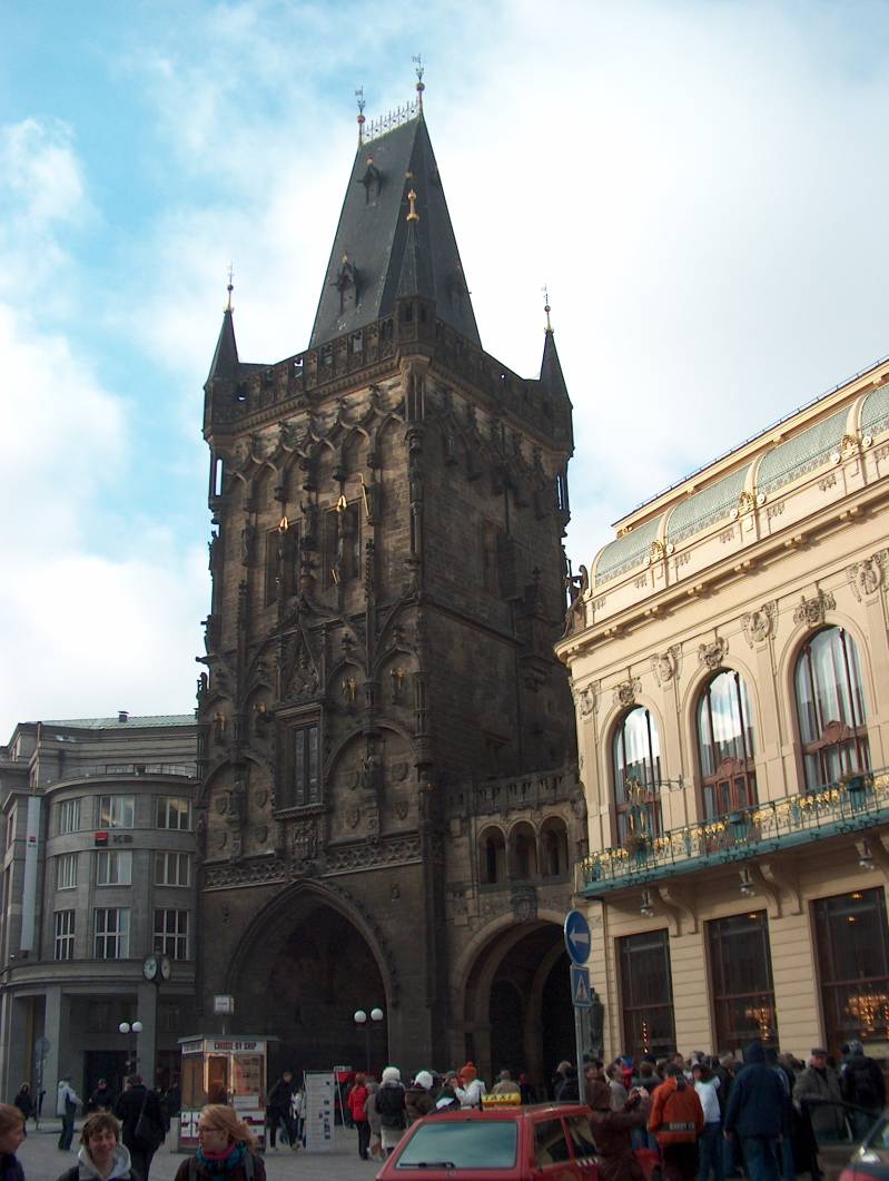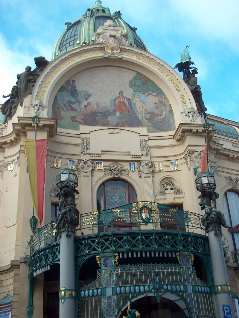 De stadhuistoren en het representatiehuis obecni dum, typisch gebouw in de Praagse Jugendstil en zetel van het Praagse filharmonisch orkest. Schilderijen, mozaiekwerk en sculpturen illustreren de Boheemse mythologie. Twee restaurants en het grootste artdecocafe van Praag bevinden zich onder hetzelfde dak. Aan het twee verdiepingen hoge plafond hangen reusachtige geelkoperen kroonluchters. Na een wandeling door de stad ga ik hier wat opwarmen met warme chocolademelk en rum. Die kost hier wel een flinke duit kronen, maar dan heb je ook wat!