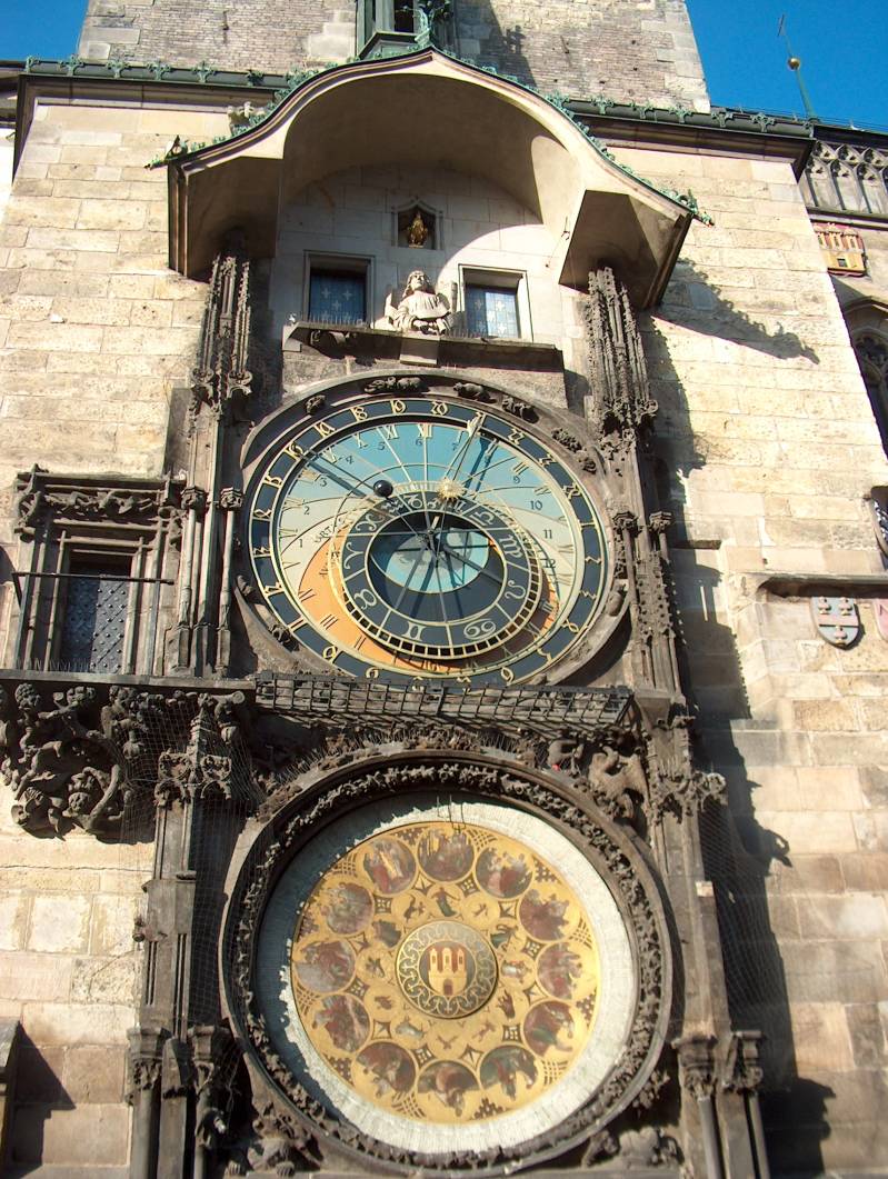 Het stadhuis met de astronomische klok. Elk heel uur wachten veel toeristen voor het stadhuis om de 12 apostelen te zien. Ze verschijnen voor de raampjes van de klok Orloj, in 1490 voltooid door klokkenmaker hanus. De gemeenteraadsleden lieten hem door een gloeiend zwaard de ogen uitsteken, zodat hij zoiets moois nooit meer kon maken.