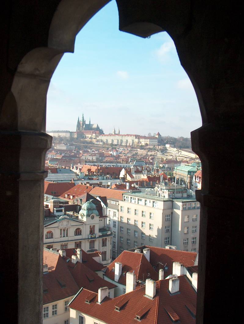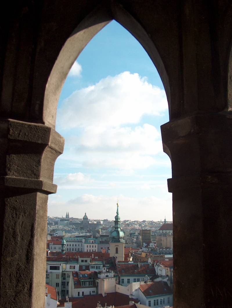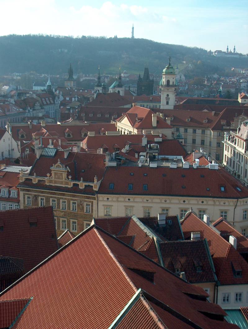 Het ene na het andere adembenemende doorkijkje en uitzichten op de oude binnenstad vanaf de 69 meter hoge stadhuistoren. Vele camera's maken overuren in Praag.